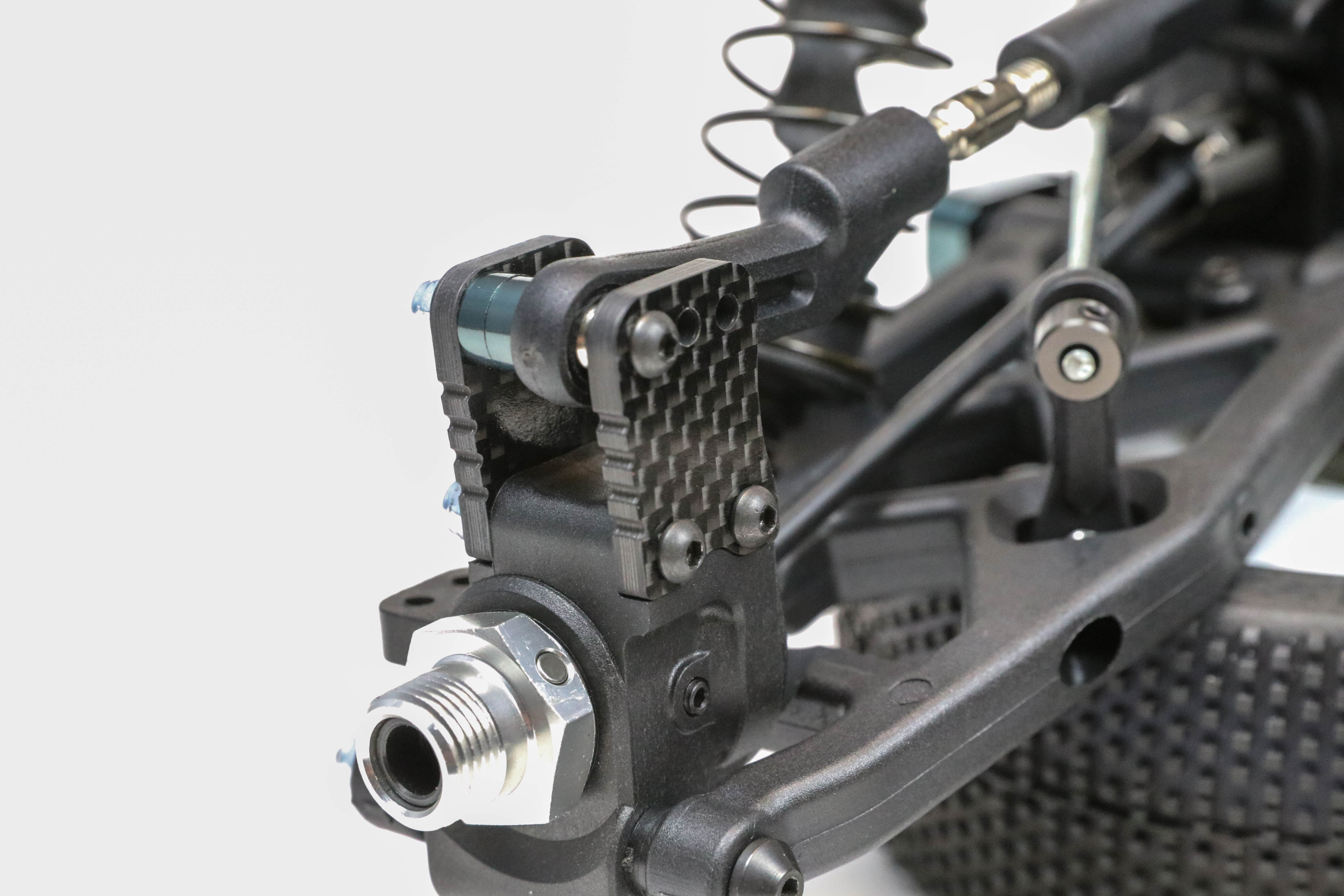 New suspension mounts and geometry. The MBX8R uses new narrow RF (C) and RR (D) pivot blocks with new pivot inserts for increased tuneability. New longer box-shaped suspension arms and arm stiffeners. The rear arm uses an impact resistant material for increased durability. Adjusting the hardness of the lower suspension arms is possible with optional CFRP plates. The rear uprights are also new for the MBX8R. The molded uprights have CFRP plates to adjust rear roll center.